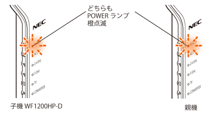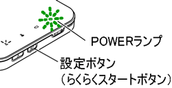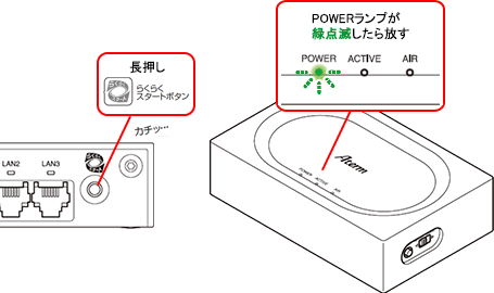 親機を旧型の外付け無線lan機器wg1900hpkpと接続する場合には、wg1900hpkpの「らくらくスタート」ボタンを長押ししてください。 5 無線LAN子機の POWERランプがオレンジから緑点灯に戻った後、しばらくして、無線LAN子機前面の「ACTIVE」ランプが緑点灯または2 各ledが通常点灯したらすぐに、無線LANアクセスポイント(親機)の設定ボタン(らくらくスタートボタン) を長押し(約6秒)して、powerランプが緑点滅になったら離す ※設定ボタン(らくらくスタートボタン)は、画面が表示されてから1分以内に押してください。2音声案内に従って、親機(wr7610hv,wd605cv)の無線スタートボタンを押し続け、powerランプが緑点滅に変化するまで押し続けます。 < 親機側のらくらく無線スタートボタン > 3以下のように表示されていることを確認します。