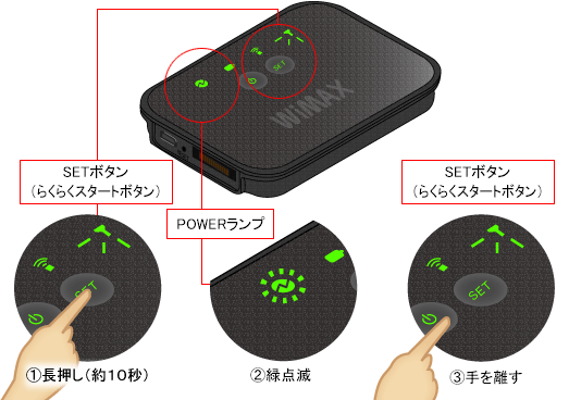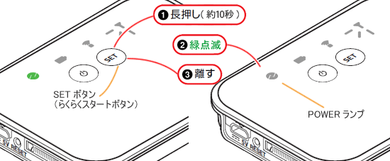 ディスプレイに「指示に従ってsetボタンを押してください」と表示されたら、らくらくスタートボタンを表示が切り替わるまで長押しする 4 ディスプレイに「wifi設定」と表示されたら放す powerランプが緑点滅しています ※